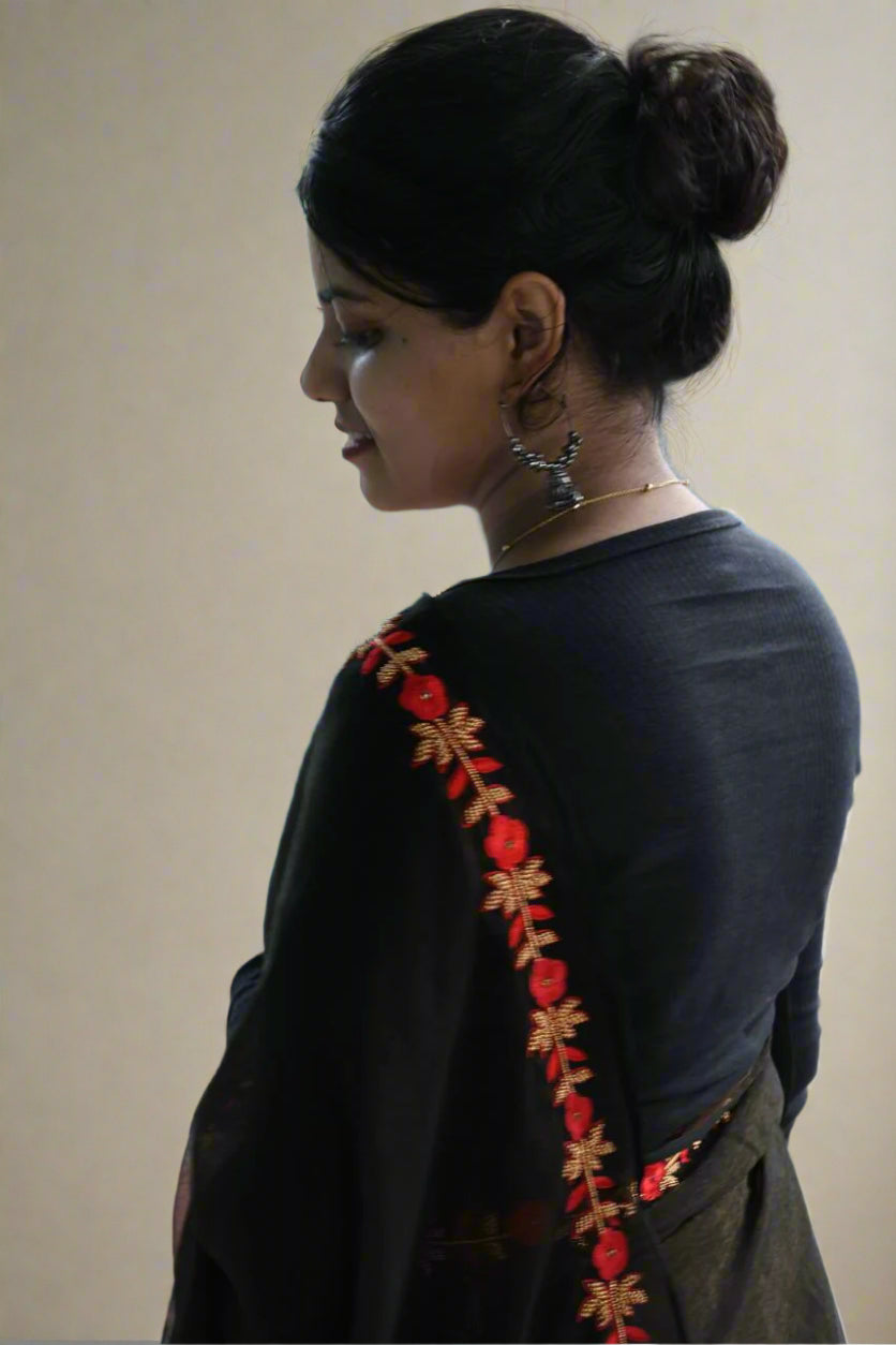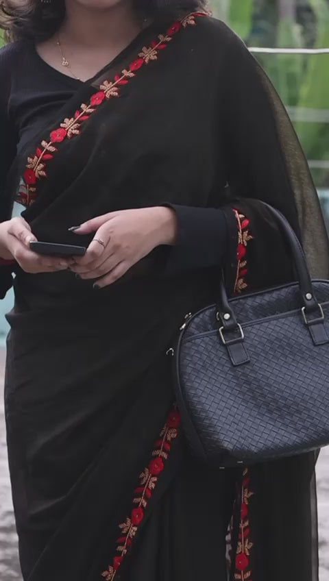 Elevate your style and exude elegance with our black saree with red embroidered border. Perfect for any function, this saree is a must-have for the fashion-forward and the young generation. Its stunning design will make you stand out and its quality fabric ensures comfort and durability. Elevate your wardrobe with this beautiful and versatile saree.